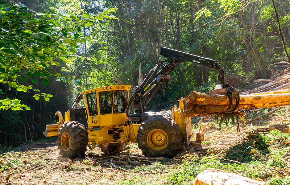 “The TCi is built better than the other skidder offerings and the locally made skidders,” Aurélien explains. “People think that it is too big and heavy, but that is just a false perception. It really is not.” He says the 612 achieves 25 percent greater production than smaller European skidders that have typically been used in France. “The visibility, position and control of the crane, and the extra power make it a better skidder,” he adds. “It is much more stable to lift much heavier loads to the side with the crane without a wheel coming off the ground. It is not confined to skidder tracks and often works in the forest in very difficult terrain.”