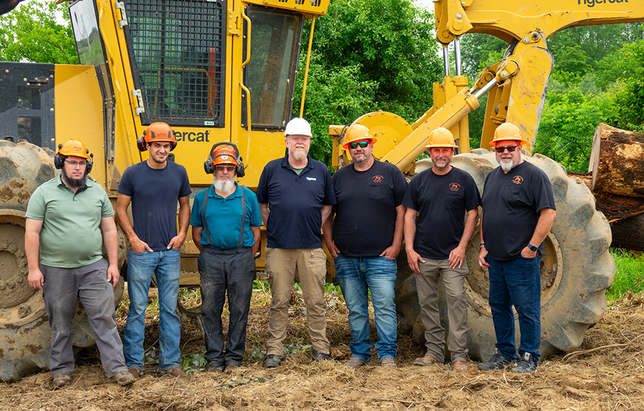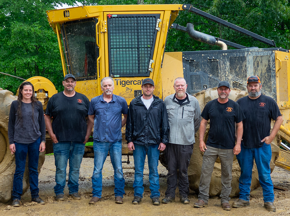 (De gauche à droite) Paul Stutzman, propriétaire de Fryburg Logging ; Elvin Swarey, opérateur de débardeur pour Fryburg Logging ; Dan Weaver, opérateur de chargeuse pour Fryburg Logging ; Jerry Smeak, responsable de district Tigercat ; Danny Gatrell, directeur des ventes régional de Ricer ; Troy Sneddon, directeur des ventes régional de Ricer ; Loren Ricer, responsable des concessionnaires de Ricer.