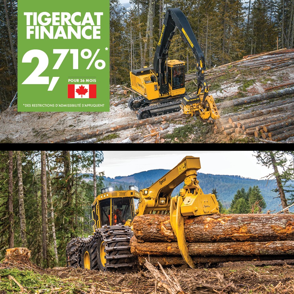 * Les offres de financement sont disponibles sur approbation du crédit pour une durée limitée. Offres sujettes à modification, prolongement ou annulation à tout moment, sans préavis. Ce programme est disponible seulement au Canada et applicable uniquement aux produits Tigercat-TCi OEM. La réduction peut ne pas s’appliquer aux produits qui ne sont pas des produits Tigercat-TCi OEM, tels que les accessoires. Veuillez contacter votre concessionnaire pour connaître les détails du programme.